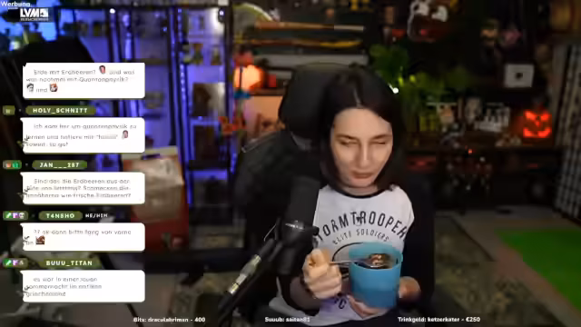 01:54:03Es wird eine humorvolle Werbepause eingeleitet, in der die Zuschauer aufgefordert werden, im Stream zu bleiben, während die Streamerin kurz abwesend ist, um Batterien zu suchen, ein Ladekabel anzuschließen oder ein Paket entgegenzunehmen. Die Zuschauer werden ermutigt, sich Getränke und Snacks zu holen und die Toilette aufzusuchen. Nach der Pause präsentiert die Streamerin ihr Müsli, das Erdbeeren und Schokopops enthält, und scherzt, dass es ein „Quantenmüsli“ sei, bei dem die Erdbeeren die Quanten und die Schokopops die Physik darstellen. Sie beschreibt den intensiven, fruchtigen Geschmack der Erdbeeren und ihre leicht matschige Konsistenz im Müsli, die eine säuerlich-fruchtige Geschmacksexplosion am Gaumen hervorruft, obwohl sie eine leichte Allergie gegen manche Früchte hat.