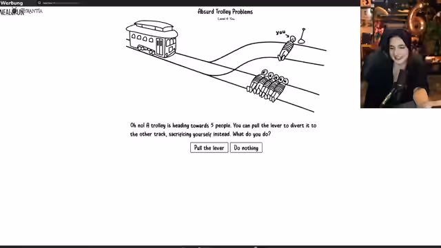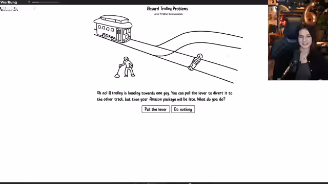 03:36:17Der Streamer präsentiert eine Reihe bekannter moralischer Dilemmata, bekannt als das 'Trolley-Problem'. Es geht um die Entscheidung, an einer Weiche fünf Menschen zu opfern oder eine einzelne Person zu retten. Die Diskussion erweitert sich um Fragen des Überlebenstriebs, des eigenen Lebenswerts gegenüber dem anderer und der Verlockung, für Geld eine Entscheidung zu treffen, die eigentlich moralisch fragwürdig ist.