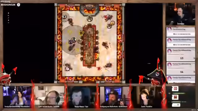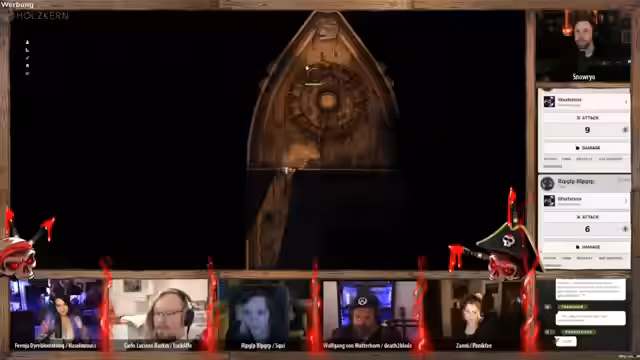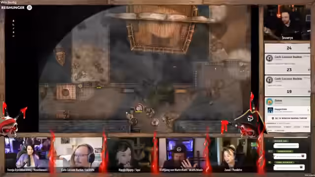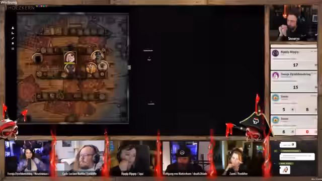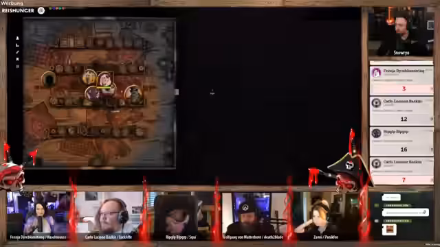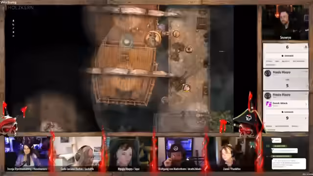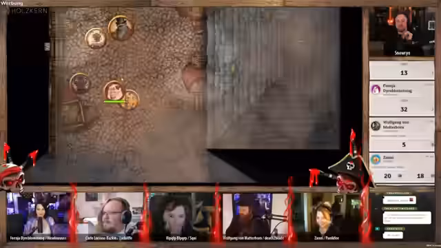 04:23:12Die Anführerin der Piraten konfrontiert die verbliebenen Spieler mit toten Augen und verlangt Antworten. 'Wolfgang' versucht, die Situation zu beruhigen und behauptet, der gefangene Halbling sei der alleinige Übeltäter. Die Lüge fliegt jedoch auf, als die Anführerin die Leiche des im Wasser liegenden Zwerges erwähnt, was sie in eine wütende Rage versetzt und direkt zu einem neuen, gefährlichen Konflikt eskalieren lässt.