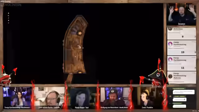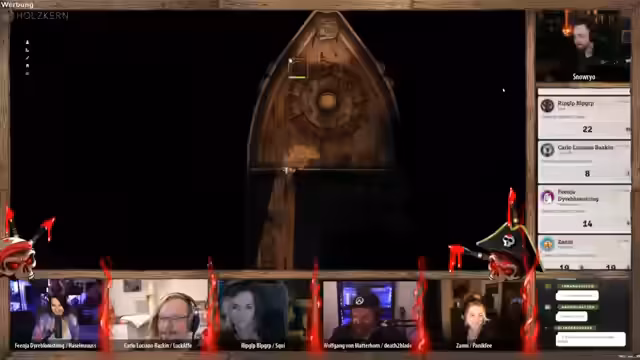 04:03:53Während der Charakter 'Hazel' sich in einen Affen verwandelt, um sich unbemerkt durch das Schiff zu bewegen, klettern andere Spieler außen am Schiff entlang. Ihr Ziel ist, durch Fenster in die Kajüten zu blicken und nach der Kiste zu suchen. Dabei werden sie jedoch von feiernden Piraten entdeckt, die sofort zu ihren Waffen greifen und die Situation eskalieren lassen.