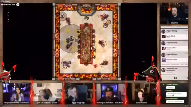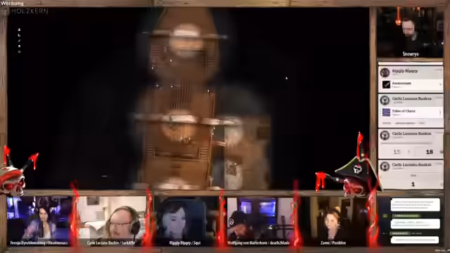 05:30:47Im Inneren des Frachtraums entdecken die Charakteren eine Kiste. In ihr findet sich ein düsteres Gemälde, das den Titel des Streams widerspiegelt. Es zeigt eine groteske Szene: leere, schwarze Augen, die ein überreichliches Festmahl in einer Halle mit einem Lavabecken anstarren. Dieses Bild scheint der Schlüssel zur Mission oder der Ursprung des Übels zu sein und deutet auf ein tieferes, düsteres Geheimnis hin.