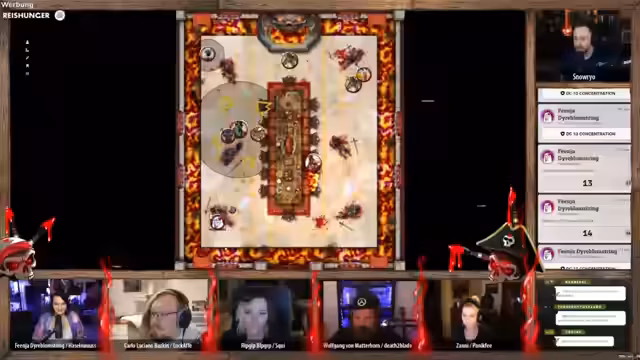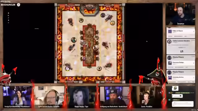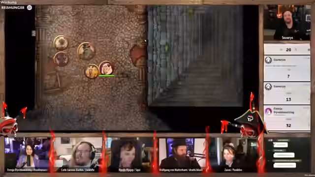 00:56:03Spielleiter Snow gibt einen Überblick über das bevorstehende Abenteuer 'Festmahl der Lügen'. Es handelt sich um einen One-Shot in einer selbstentwickelten Fantasy-Welt, der eine Mischung aus offiziellen D&D-Regeln und eigenen Homebrew-Regeln nutzt. Die Geschichte ist komplett selbst geschrieben und wird mit Hilfe von Foundry VTT gespielt. Snow erklärt das Grundprinzip von Pen & Paper und stellt die Rolle des Spielleiters gegenüber den Spielern heraus, um den Rahmen für das Rollenspiel zu setzen.