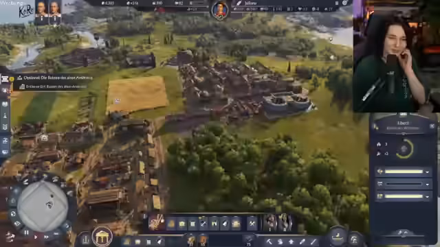 01:53:22Nach dem Minecraft-Teil wurde ein neuer Spielmodus gestartet: das neuste Spiel der Anno-Reihe. Die Streamerin spielte die Geschichte als Markia Teretia, eine junge Patrizierin, die in eine politische Zwangsehe mit einem kranken römischen Prätor gezwungen wird. Die ersten Schritte umfassten das Bauen eines Wohnhauses und die Erstellung eines Holzfällers, um die Stadt Juliana aus den Ruinen zu errichten und die Grundbedürfnisse der Bevölkerung zu befriedigen, während sie gleichzeitig die übergeordnete Geschichte verfolgte.