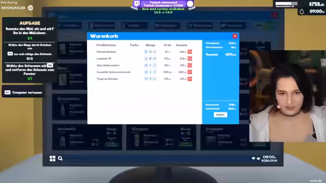 01:23:22Die Streamerin versucht im Supermarkt-Simulator, den Überblick über das Sortiment zu behalten, stößt aber auf große Verwirrung. Das Platzieren von Produkten im Lager und das Verständnis der Spielmechaniken gestalten sich schwierig. Die Benutzeroberfläche wird als unübersichtlich beschrieben, und das ständige Nachfragen nach benötigten Ressourcen führt zu wachsendem Frust, besonders bei den persönlichen finanziellen Verlusten im Spiel.