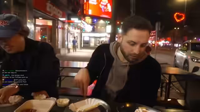 02:04:37Ein externer Kiez-Experte wird zugeschalten und befragt, welches das beste Essen auf der Reeperbahn ist. Er empfiehlt gute Döner und Burger, aber auch sonstiges Fast Food. Die Streamer diskutieren regional unterschiedliche Begriffe für Kioske ('Späti' in Berlin, 'Bütchen' in Köln, 'Kiosk' in Hamburg). Aufgrund von Hunger nach dem langen Spaziergang wird beschlossen, einen Imbiss aufzusuchen. Die Route zur Polizeistation Davidwache wird humorvoll als 'Speedrunner'-Trick propagiert, und schließlich entscheiden sich die Streamer für ein spontanes Essen.