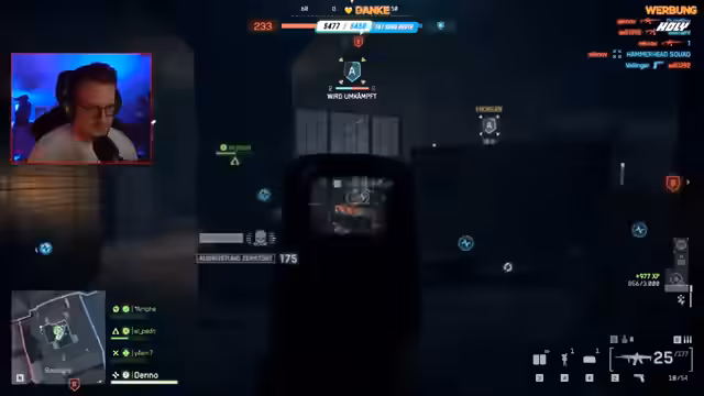 09:38:12Während des Battlefield-Spiels interagiert der Streamer mit dem Chat, beantwortet Fragen und nimmt Spenden entgegen. Das Team arbeitet daran, die Tickets des Gegners zu reduzieren, während es自身的 Verluste minimiert. Es werden taktische Entscheidungen getroffen, wie der Einsatz von Drohnen und der Wechsel von Klassen, um die Spielzonen zu halten und den Sieg zu erringen.