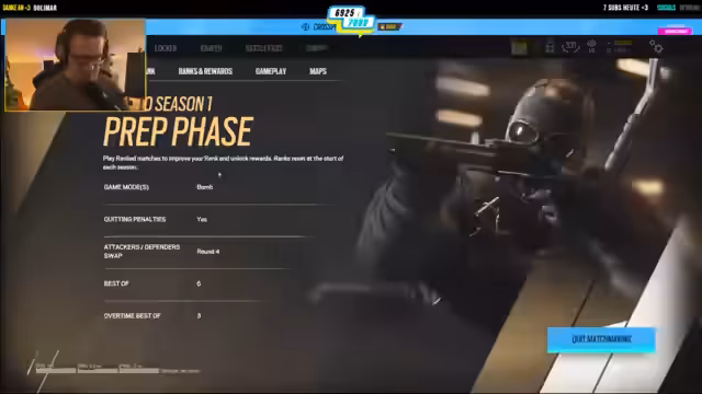 06:08:23Stream beginnt um 22:10 Uhr mit Rainbow Six. Es gibt technische Schwierigkeiten bei der Charakterauswahl, der Streamer wählt Echo und erwähnt, dass er 1000 Mal auf Echo gedrückt hat, ohne Erfolg. Das Gameplay zeigt Frustration über Langsamkeit und technische Probleme. Stream kündigt an, bis 3 Uhr morgens zu spielen, wenn 7000 Subs erreicht werden.