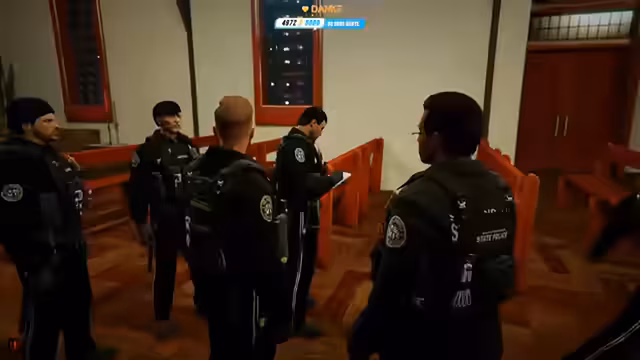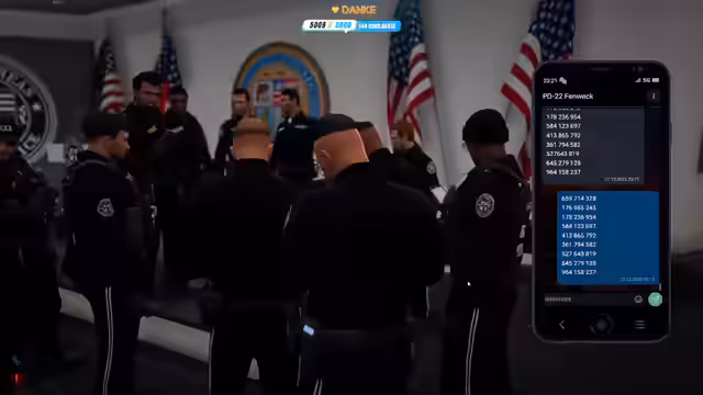 04:35:56Bei einem Meeting der State Police werden die jüngsten Ereignisse zusammengefasst: Gepanzerte Fahrzeuge drehten Kreise in Downtown und Vespucci, es gab Schießereien am bunten Parkhaus und einen Angriff auf Sandy Shores Department mit Scharfschützenfeuer. Das ungelöste Rätsel (Brückenrätsel) bleibt zentral, mit der Frage, ob es zu Ortskoordinaten führt. Es folgen Beförderungen: Mr. Corbin wird zum Sergeant befördert für seine Führung im Funk und gute Arbeit. Taylor Ricks wird für mutige Einsätze während Schießereien gelobt. Die Kollegen werden ermutigt, das Rätsel weiter zu analysieren.