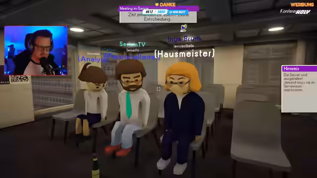08:45:39Der Höhepunkt der internen Konflikte erreicht seinen Höhepunkt, als ein Dokument am schwarzen Brett gefunden wird, das den Chef als Kacke bezeichnet. Dies führt zu einem Streit mit dem Manager, dem vorgeworfen wird, die anderen gegen den Chef aufzuwiegen. Nach heftigen Auseinandersetzungen wird schließlich Herr Serium gefeuert. Der Streamer stellt fest, dass die Runde sehr troll-lastig war, denkt aber über eine weitere Runde nach, da das Spiel Spaß gemacht hat, und schlägt Alternativen wie Among Us oder Age of Empire vor.