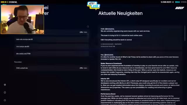 00:22:42Der Streamer begrüßt das Publikum und kündigt direkt die erste wichtige Neuerung für das bevorstehende 5M Update von LuckyV.de an. Es wird einen komplett neuen Charaktereditor geben, der den Spielern ermöglicht, den Charakter in verschiedenen Umgebungen zu testen. Dazu gehören die Wahl von zwei Eltern, die Beeinflussung von Tageszeit und Wetter sowie das Platzieren des Charakters an verschiedenen Orten wie Hallen oder im Freien, um alle Lichtverhältnisse zu sehen. Die Ankündigung wurde im offiziellen Lucky5 Discord veröffentlicht, wo auch ein kurzes Video zu sehen ist.