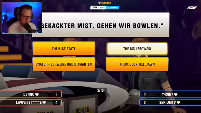 08:03:38Es folgen weitere Spiele wie Bullenreiten und ein Spiel, bei dem Zitate aus Filmen erraten werden müssen. Beim Bullenreiten müssen die richtigen Tasten gedrückt werden, um nicht vom Bullen zu fallen. Beim Filmzitate-Spiel müssen die Spieler buzzern und aus vier Optionen die richtige Antwort auswählen. Es kommt zu Frustration, da einige Spieler das Spiel als nicht so unterhaltsam empfinden wie erwartet. Es treten erneut technische Probleme auf, da das Spiel abstürzt und Spieler aus der Lobby fliegen. Dies führt zu Diskussionen über das Punktesystem und ob die bisherigen Punkte gewertet werden sollen. Es wird kritisiert, dass das Multiplayer-Spiel schlecht programmiert ist und nicht richtig funktioniert. Trotz der technischen Schwierigkeiten wird überlegt, eine neue Runde zu starten, aber die Frustration überwiegt. Es wird entschieden, dass Vivi und Denno nach Punkten gewonnen haben, aber die Entscheidung ist umstritten.