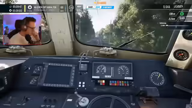00:17:14Der Streamer übernimmt die Steuerung eines alten Personenzuges DB BR 110 470 2. Schon bald treten die ersten Probleme auf, als die Zugsicherung den Stromabbau anfordert. Nachdem die Lokomotive wieder einsatzbereit ist, wird die Abfahrt eingeleitet, wobei der Zug als sehr alt und dreckig beschrieben wird. Während der Fahrt werden mehrere kritische Situationen bewältigt, wie das Fahren bei niedriger Geschwindigkeit und der Umgang mit Notbremsen und Bremsschlüsseln.