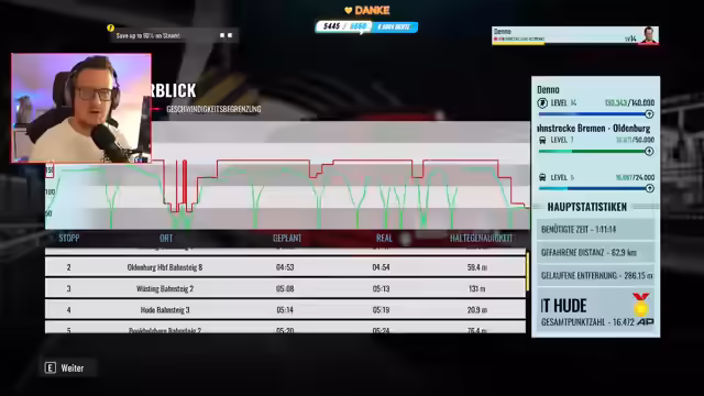 02:06:27Der ICE erreicht Bremen Hauptbahnhof fast pünktlich, obwohl zuvor noch der Bahnhof in Oldenburg besichtigt wurde. Es wird die Deutsche Bahn gelobt und angeboten, im Führerstand eines ICE mitzufahren. Es wird der Wunsch geäußert, einmal mit einem IC3 und einer DBB 143 zu fahren. Es wird sich bei den Zuschauern für den Support bedankt und auf die Möglichkeit hingewiesen, nach Hamburg umzusteigen. Es wird überlegt, warum man ein Archiven bekommt, wenn man 40,1 Kilometer gefahren ist. Es wird die Weser überquert und festgestellt, dass es quietscht, wenn der Zug eine Kurve fährt. Es wird langsam in den Bahnhof eingefahren und festgestellt, dass dort viel los ist. Es wird bedauert, dass man die Kollisionen im Spiel nicht ausschalten kann. Es wird der Wunsch geäußert, längere ICE-Strecken fahren zu können.
