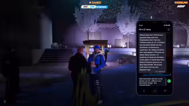 06:10:09Im Rollcall werden zahlreiche Straftaten und Spannungen zwischen Gangs angesprochen. Dazu gehören ein missglückter Überfall und Geiselnahme, bei dem die Aztekas indirekt beteiligt waren, sowie Morddrohungen zwischen den Wolf of Mayhems und einem anderen Mayhem-Mitglied. Auch Sachbeschädigungen und Wohnungseinbrüche im Norden der Stadt werden gemeldet. Zudem wurde eine tote Police Officerin, Miss Lea Stark, tot aufgefunden.