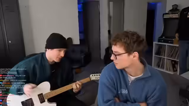 01:02:10Der Streamer zieht eine E-Gitarre hervor und erklärt, dass er auf der kommenden Tour nicht nur Akustik-, sondern auch E-Gitarre spielen möchte. Er stimmt das Instrument notdürftig und spielt, ohne Plektrum, einige Akkorde. Er äußert sich positiv über die enge Bindung zur Community und kündigt an, auf der Tour möglicherweise zu streamen. Er wirbt für Follows und nennt den nächsten geplanten Stream am 25. des Monats.