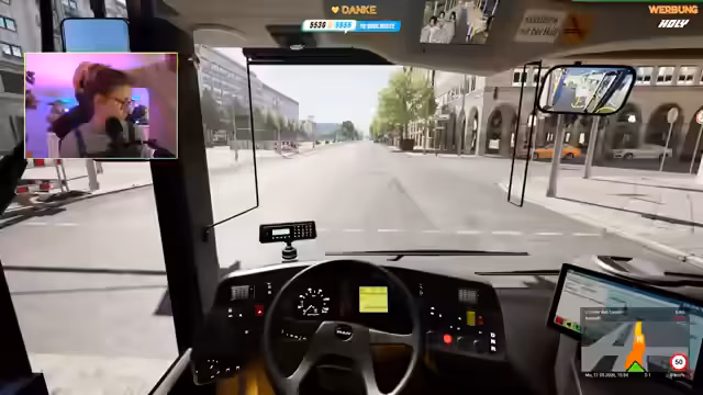 01:47:10Der Stream beginnt mit dem Start der Fahrt im Spiel. Auf der Route werden Fahrgäste bedient und deren Tickets kontrolliert, wobei sowohl Barzahlung als auch kontaktlose Zahlung akzeptiert werden. Der Stream erwähnt ihren Kanal auf Instagram, wo man die aktuelle Fahrt in einer Story ansehen kann. Während der Fahrt gibt es unvorhergesehene Situationen, wie andere Verkehrsteilnehmer, die gefährlich manövrieren.
