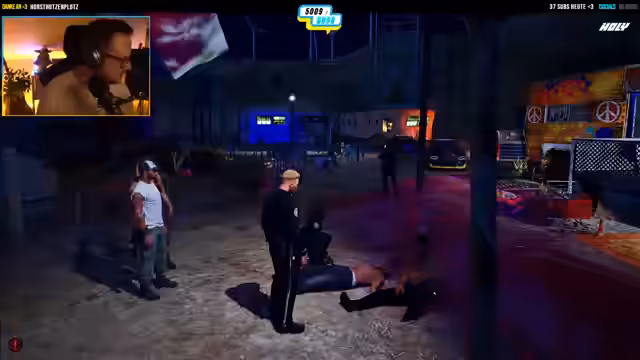 03:43:35Die Situation eskaliert, als drei Personen, die als verdächtig galten, angehalten werden. Es entwickelt sich ein improvisierter Boxkampf zwischen einem Officer und einem der Anhalter, der unter Einverständnis stattfindet. Der Anhalter verliert den Kampf und wird bewusstlos. Es werden Fotos gemacht, und die Feuerwehr wird gerufen, da auch ein Grill umgeworfen wurde. Der Streamer betont, dass es sich um einen fairen Kampf mit Einwilligung handelte, um einen Ruf im Norden aufzubauen.