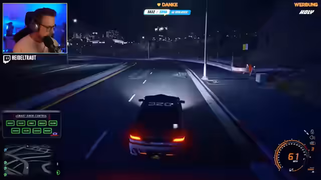 07:33:56Der Streamer startet einen Einsatz im Spiel. Er und sein Kollege, Police Commissioner Weiß, übernehmen das Fahrzeug 320 und fahren wie Go-Karts durch die Stadt. Sie werden zu einer Wohnung alarmiert, an der ein Einbruch gemeldet wurde. Obwohl sie das Gebäude kontrollieren, können sie niemanden finden. Anschließend wird der Fahrer eines weißen Sportwagens beobachtet, der flieht und sich sehr rasant verhält, woraufhin die Verfolgung beginnt.