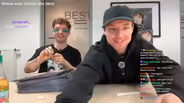 00:17:20Während der Unterschrift-Aktion gibt Pascal, ein Experte des Presswerks, Einblicke in den Herstellungsprozess. Er erklärt die Besonderheiten der Schallplattenpressung im Vergleich zur CD-Herstellung und betont die hohe Qualität der 'Vier Augen'-Vinyls, die einen extra Lack für den Schriftzug aufweisen. Max erklärt im Chat den Prozess der Musikwiedergabe auf Vinyl für Laien.