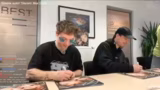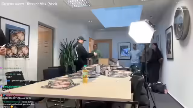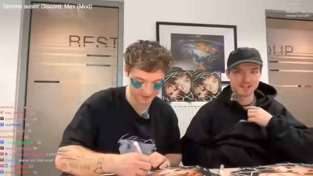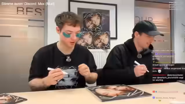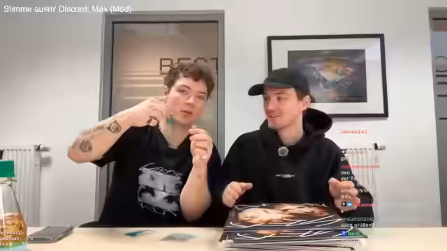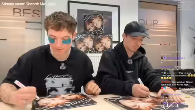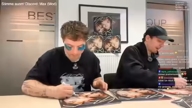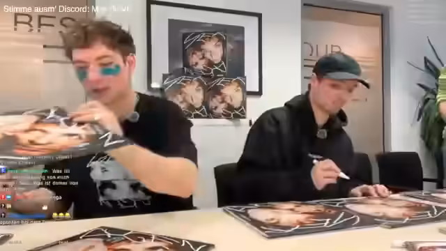 01:03:02Das Stream-Team beginnt mit dem signieren von Vinyl-Platten und CDs. Der Fokus liegt darauf, die Farbe der Tinte sichtbar zu machen und die Stücke vor dem Signieren vorzubereiten. Während des Vorgangs werden Fotos vom Signierprozess gemacht, um den Moment festzuhalten. Ein Teilnehmer, Max, wird gebeten, kurz das Mikrofon abzunehmen, damit reibungslos Fotos entstehen können. Im Hintergrund wird der Chat gefragt, welche Themen besprochen werden sollen, um die Wartezeit zu überbrücken.