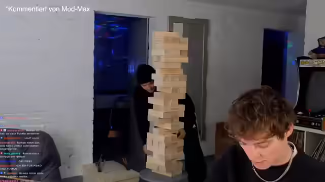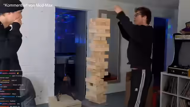 00:40:26Ein regeltechnischer Konflikt entsteht, als einer der Spieler einen Stein entfernt hat, der Turm aber umzufallen droht. Der Spieler legt den Stein daraufhin zurück, was vom Gegner als regelkonform anerkannt wird. Später kommt es zu einem weiteren entscheidenden Moment, als ein Turm fast komplett zusammenbricht, aber wieder aufgerichtet werden kann. Die Wettquoten auf Twitch ändern sich dynamisch.