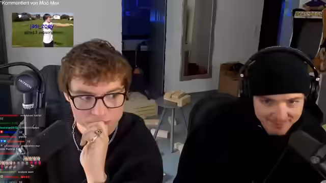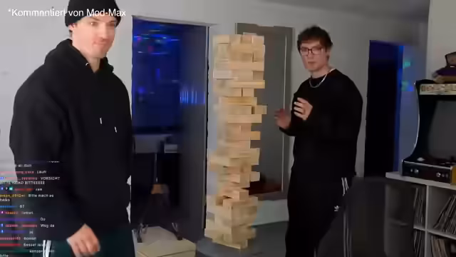 00:09:00Der Stream beginnt mit den Streamern Heiko und Roman, die sich gegenseitig begrüßen und den Zuschauern einen guten Mittag wünschen. Sie berichten, dass ihr gemeinsamer Freund Nico nicht anwesend ist und begrüßen die Zuschauer herzlich. Der Hauptinhalt des Streams wird angekündigt: ein großes XXL-Jenga-Duell zwischen den Zwillingen, das als Spektakel präsentiert wird und bei dem auch eine interaktive Kanalwette stattfindet.