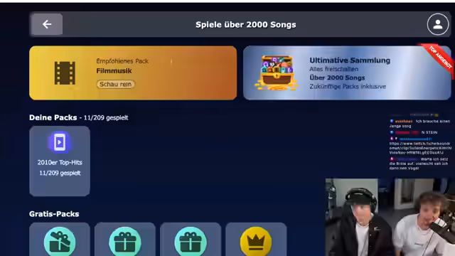01:27:24Nach mehreren Songs wechseln die Streamer die Kategorie und erkunden verschiedene Spieloptionen wie Filmmusik, 80er Smash-Hits und europäische Chart-Hits. Sie entscheiden sich für eine schwere Runde mit einem Song, der 4,4 Milliarden Klicks hat und identifizieren später Counting Stars von One Republic. Dabei nutzen sie auch die Chat-Funktion und planen für zukünftige Streams verschiedene Multiplayer-Spiele wie It Takes Two.