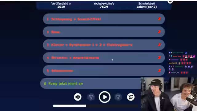 01:01:50Die Streamer starten ein weiteres Songerraten-Spiel, bei dem sie abwechselnd versuchen, Lieder anhand von kurzen Ausschnitten zu erkennen. Sie einigen sich auf eine Regel, bei der ein Fehler des Gegners eine weitere Chance für den anderen bedeutet. Emote-Ted wird als Startsong gewählt und Heiko behauptet sofort, es handle sich um Cake by the Ocean, was sich jedoch als falsch herausstellt.