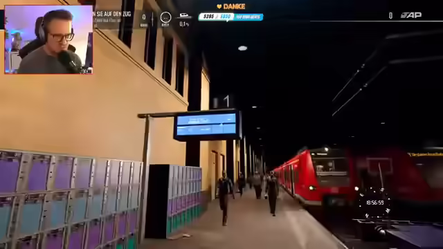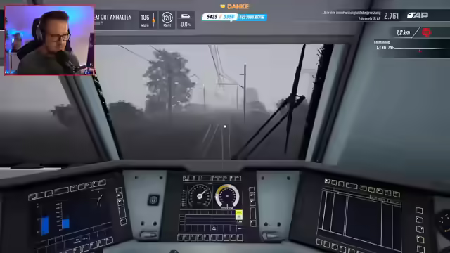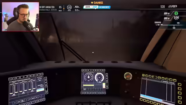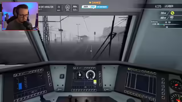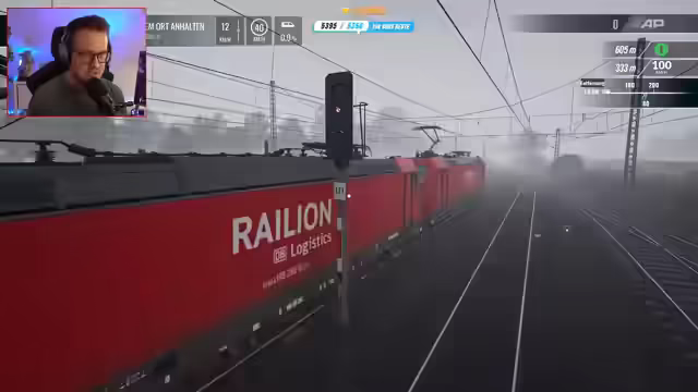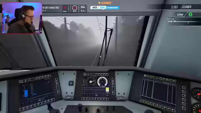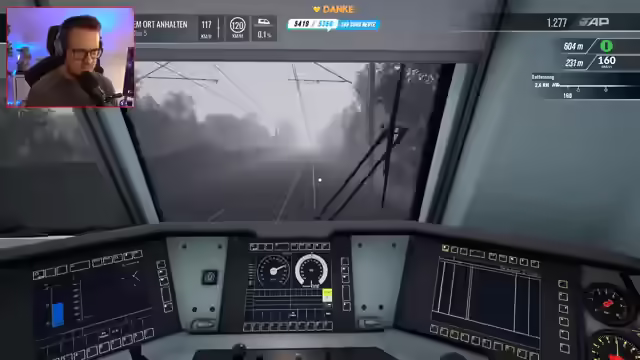 01:51:47Die Fahrt führt durch verschiedene Stationen wie Frankfurt-Höst und Farbwerke, wobei die Schwierigkeit besteht, im dichten Nebel die Strecke zu erkennen. Es wird festgestellt, dass die Sicht immer schlechter wird, je weiter man von Frankfurt wegfährt. Trotz der schlechten Sichtverhältnisse wird versucht, pünktlich zu sein, aber es kommt zu kleineren Fehlern beim Bremsen. Plötzlich läuft eine Person über die Gleise, was zu einer Notbremsung und einer Traktionssperre führt. Nach einigen Schwierigkeiten kann das Problem behoben werden und die Fahrt wird fortgesetzt, jedoch mit einer Verspätung von etwa zehn Minuten. Während der Fahrt wird ein bevorstehender 48-Stunden-Livestream auf Twitch angekündigt, bei dem verschiedene Spiele gezockt werden.