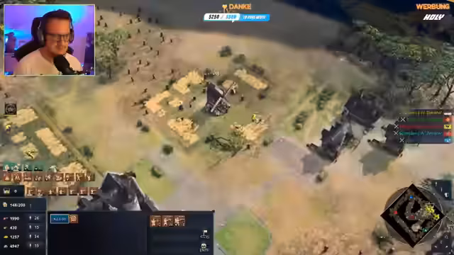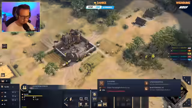 01:42:15Der Stream beginnt mit einer Spielrunde, in der die Spieler über Einheiten und Upgrades diskutieren. Es werden Balance-Probleme angesprochen und Taktiken für Ressourcenverteilung und Stärken verschiedener Einheiten wie Elefanten geplant. Die Interaktion unter den Spielern zeigt Kooperation und strategisches Denken, wobei Spannungen über fairen Spielaufbau deutlich werden.