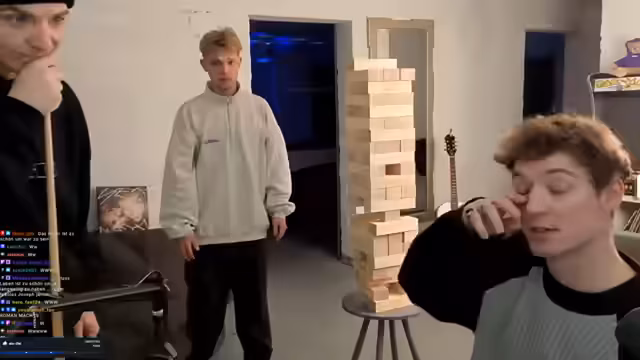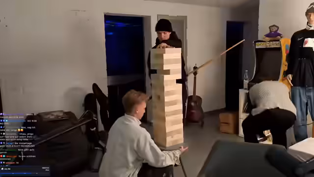 00:21:08Das Spiel wird zunehmend angespannt, insbesondere als Heiko mit einem Billardstock nachhilft, um einen besonders fest sitzenden Stein zu lockern. Diese unkonventionelle Aktion sorgt für Aufsehen im Chat. Parallel läuft eine Kanalwette, bei der die Zuschager darauf wetten, welcher Spieler das Spiel gewinnt. Die Spannung steigt weiter, als der Turm gefährlich zu wackeln beginnt.