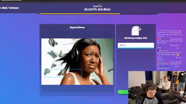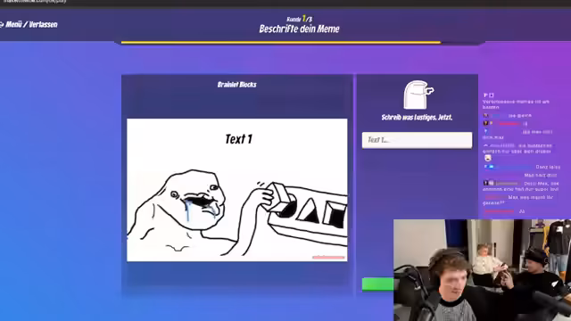 01:52:17Die Streamer starten spontan das Spiel 'Make It A Meme'. Nach anfänglicher technischer Unsicherheit, in die sich auch Gäste wie Liska und Nico einloggen, wird das Spielprinzip erklärt: Die Mitspieler erhalten ein zufälliges Meme-Bild und Zeit, einen eigenen, humorvollen Text hinzuzufügen. Die erstellten Memes werden anonym präsentiert, woraufhin alle Teilnehmer für die lustigsten Einträge abstimmen können. Das erste Spiel erweist sich für die Gruppe jedoch als ungewohnt und die Runde wird als eher schwierig und langweilig empfunden.