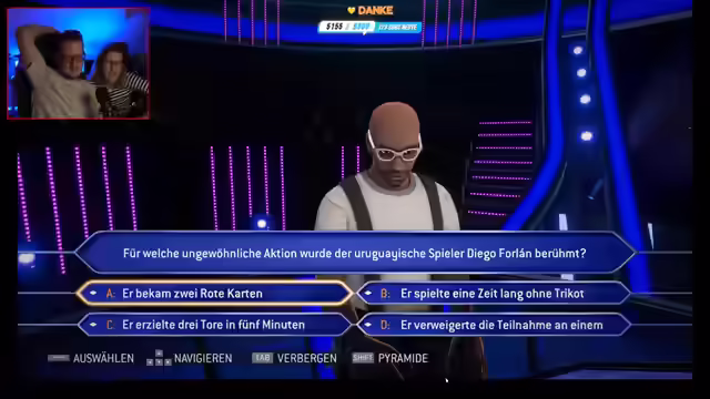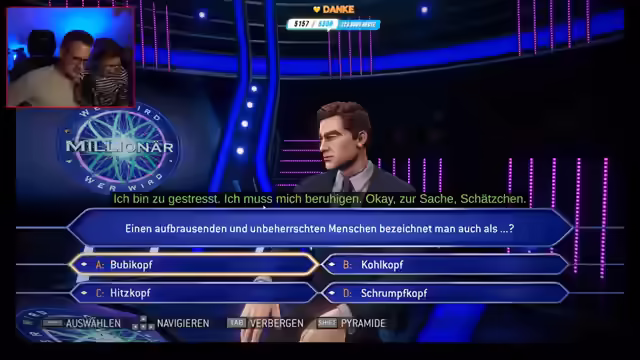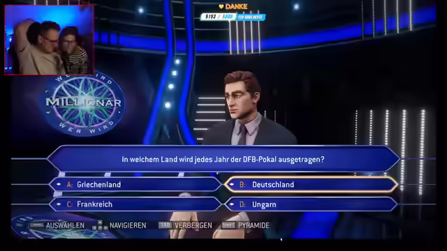 08:48:58Es wird eine Challenge gestartet, bei der zu viert "Wer wird Millionär?" gespielt wird. Der Chat wird gebeten, keine Antworten vorzugeben. Die Fragen werden vorgelesen, und die Zuschauer werden gebeten, nicht zu spoilern. Es wird eine Wiederholspulung Funktion genutzt. Es werden verschiedene Kategorien ausgewählt, darunter DC Comics, Manga, Star Wars und Harry Potter. Der Streamer bittet den Chat, keine Antworten vorzugeben und Popcorn zu holen. Es wird eine Anmoderation im Stil von "Wer wird Millionär?" gemacht. Es wird überlegt, wie weit sie es schaffen werden. Es wird entschieden, im normalen Modus ohne Timer zu spielen. Der Chat wird gebeten, nicht zu spoilern, da sonst Konsequenzen drohen. Der Streamer weist darauf hin, dass vorgestern bei Jimmy Kimmel die Millionen abgeräumt wurde.
