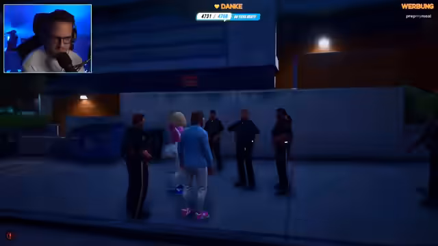 00:40:38Es beginnt eine spontane Rolleplay-Szene, bei der ein Charakter ohne gültigen Ausweis versucht, einen Laden zu überfallen. Dies führt zu einer Verfolgungsjagd mit der Polizei. Die Situation eskaliert schnell in eine Schießerei, bei der der Charakter angeschossen wird. Der Streamer übernimmt die Rolle eines verletzten Charakters und fordert medizinische Hilfe.