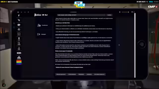 03:17:17Der Streamer wechselt das Spiel und begrüßt die Zuschauer zurück bei einer neuen Episode von GTA Roleplay auf LuckyV.de. Er nutzt die Gelegenheit, um die Community für den erreichten Meilenstein von 8000 Abonnenten zu danken und kündigt den baldigen Start eines legendären 18-Stunden-Streams an. Er gibt einen kurzen Überblick über die wichtigsten Ereignisse der letzten Ingame-Tage: den Rücktritts-Äußerungen von Walter Weiss, die Verurteilung von Lucy Middleton und die E-Mail vom FIB, die für zukünftige Entwicklungen wichtig sein wird.