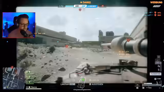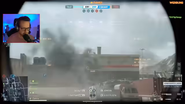 03:07:31Der Streamer befindet sich in einem intensiven Battlefield-Spiel, besonders im Durchbruch-Modus. Das Gameplay ist geprägt von chaotischen Kämpfen, strategischen Ratschlägen wie der verstärkten Nutzung von Rauchgranaten und der Koordination im Team. Es gibt spannungsgeladene Momente, in denen der Streamer unter Schutt begraben wird und sein Team unter Druck gerät, sowie begeisterte Reaktionen auf das Zerstören von Gebäuden und die actiongeladene Atmosphäre des Spiels.