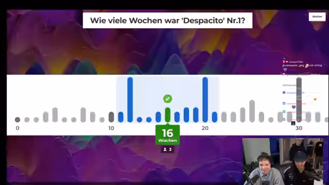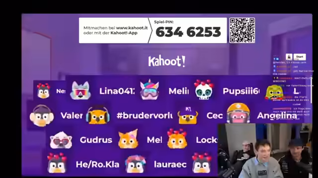 01:58:27Das Kahoot-Quiz beginnt mit 89 Teilnehmern. Die Streamer bilden ein Team und kämpfen gegen den Chat. Das Quiz ist eine Mischung aus einfachen und kniffligen Fragen zu 2010er-Hits. Währenddessen kommt es zu Diskussionen über die Antworten und einige Zeitverzögerungen. Das Team kämpft sich nach hinten, nachdem es durch eine unfair gestellte Frage einen Punkt verloren hat, kann aber wieder aufholen und landet am Ende auf Platz 3.