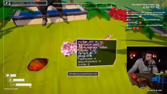 01:51:24Die Streamer analysieren die gezüchteten Kreaturen und entdecken, dass sie durch Streicheln zusätzliches genetisches Material liefern. Sie erkennen, dass einige genetische Merkmale nur selten auftreten und versuchen, diese gezielt zu sammeln. Gleichzeitig wird die Verwaltung der wachsenden Anzahl von Tieren und deren Ressourcenbedarf als komplex und aufwendig empfunden, was die Notwendigkeit weiterer Tierheime und einer optimierten Logistik unterstreicht.