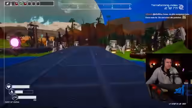 01:36:19Nachdem die Grundversorgung der Kreaturen gesichert scheint, konzentrieren sich die Streamer auf das Terraforming des Planeten. Sie starten Raketen zur Veränderung von Umweltfaktoren wie Wärme, Luftdruck und Biomasse. Es wird eine effiziente Methode für die Raketenstarts etabliert. Gleichzeitig wird der Fortschritt bei den Umweltwerten beobachtet und die Steigerung der Biomasse wird als primäres Ziel verfolgt.