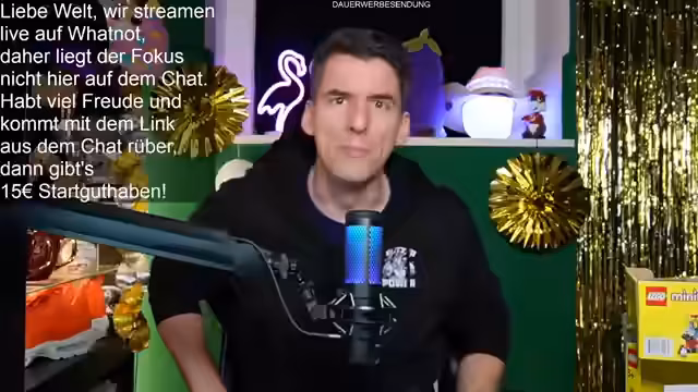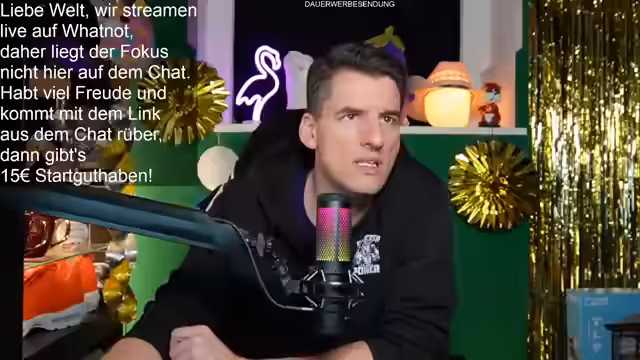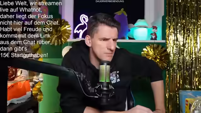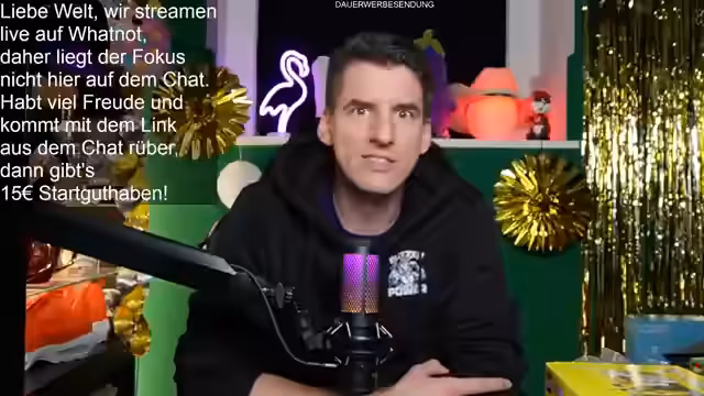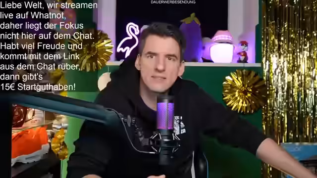 01:32:18Es wird ein Follower-Giveaway angekündigt. Neukunden, die über den angehefteten Whatnot-Link folgen, erhalten einen 15 Euro Gutschein. Für die Teilnahme am Giveaway wird kein Kauf erfordert; die Nutzer müssen nur im Chat auf "Teilnehmen" klicken. Als Gewinnes wird ein Set verschenkt, international inklusive Versand. Der Streamer betont, dass die Teilnahme bis zum Ende des Streams nötig ist, da nur die Anwesenden am Ende in den Lostopf kommen. Zusätzlich wird für den nächsten großen Stream am Sonntag um 10 Uhr mit 7-8 Geschenken geworben.