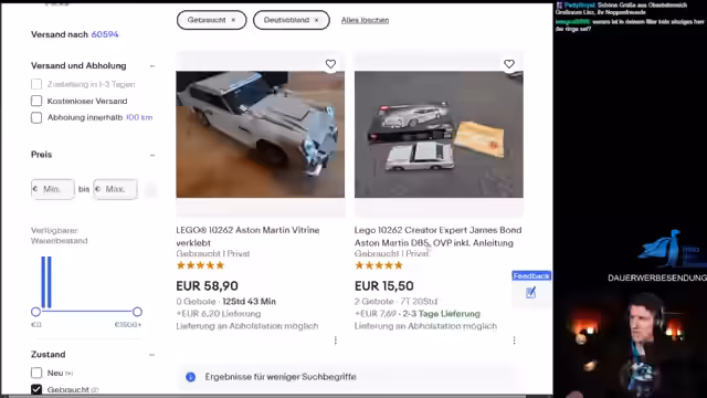 01:56:11Auf eBay entdeckt der Streamer vermehrt unseriöse Angebote. Er warnt vor Verkäufern, die nur die Box und Anleitung ohne das eigentliche Set anbieten, und bezeichnet dies als "ehrlos". Er kritisiert auch die Qualität mancher Angebote und stellt fest, dass viele Händler unrealistische Preise verlangen. Ein Beispiel ist eine Saturn 5, die für 70 Euro gebraucht angeboten wird, obwohl der Neuprie nur bei 70 Euro lag.