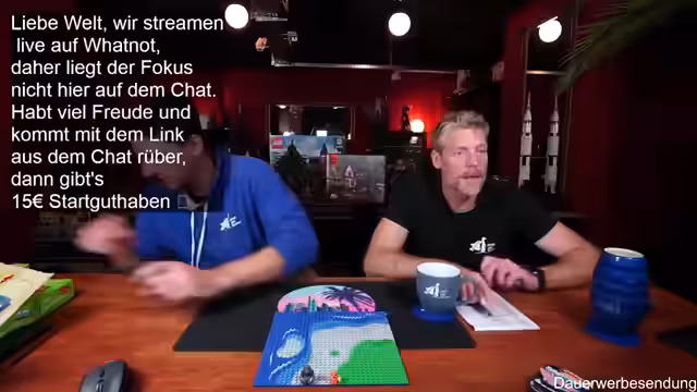 02:12:16Während des Streams werden mehrere Giveaways veranstaltet. Der erste ist ein Rasta-Formel-1-Wagen, für den alle Zuschauer qualifiziert sind, die während des Streams etwas gekauft haben. Später folgt ein größeres Giveaway eines modularen Lego-Gebäudes mit 4000 Teilen. Teilnahme erfolgt durch Klick auf einen Teilnahmeknopf, die Verlosung erfolgt per Zufall. Der Streamer betont, dass der Versand auf seine Kosten geht.