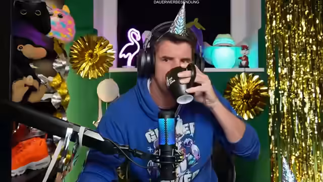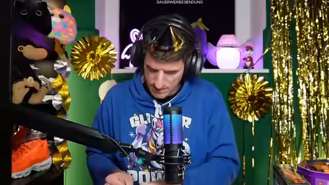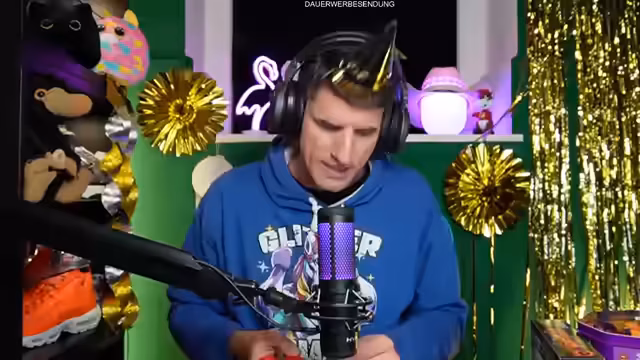 05:07:35Der Streamer sammelt die Reste des Feuerwerks und entdeckt überraschende Gegenstände wie ein Einhorn-Puzzle, Luftschlangen, Glitzermasken und Ringe. Er kommentiert die mangelhafte Qualität eines Puzzles und vergleicht es mit schlechten Kindergeburtstagen. Dabei entstehen humorvolle Momente mit überladener Partydekoration und verlorenen Hörnern.