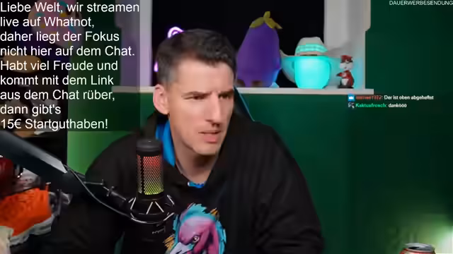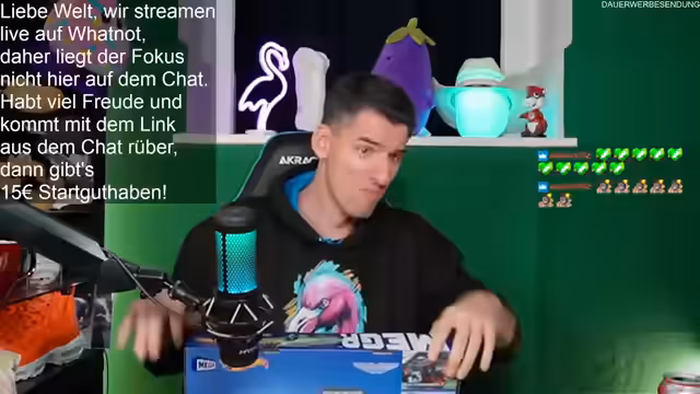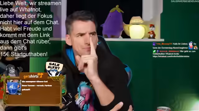 00:02:57Der Streamer begrüßt die Community und kündigt den parallel laufenden WhatNot-Stream an, der um 16:59 Uhr startet. Er erwähnt, dass der Ladenheld Simon den Laden schließt und dass der WhatNot-Stream verschiedene Produkte im Angebot hat, darunter Artikel von Noppy, Lego-Figuren, Giveaways und Michaels Produkte, die durch Flash-Sales angeboten werden. Es wird darauf hingewiesen, dass neue WhatNot-Nutzer ein Startguthaben von 15 Euro erhalten können. Der Streamer erklärt die Trennung der Produktangebote: 'HDS'-Produkte sind zur Abholung im Laden oder zum Versand durch ihn selbst, während andere Produkte von Michael versendet werden. Aktuell sind noch ein Minecraft-Set, ein Wohn- und Einkaufsstraßen-Set und die Flying Lamb von One Piece zur Abholung verfügbar. Für den Versand sind Friends-Kalender, Adventskalender von 2018 und 2022, Fuchs- und Gorilla-Figuren, Magnete, Heldenwäschenetze, T-Shirts und das Heldentape verfügbar. Zudem werden Noppy-Produkte und Brio-kompatible Artikel angeboten. Der Streamer plant, Flash-Sales für Lego-Produkte, die Michael verschickt, zu starten und muss noch die Versandoption 'Versand durch HDS' für einige seiner Produkte hinzufügen.