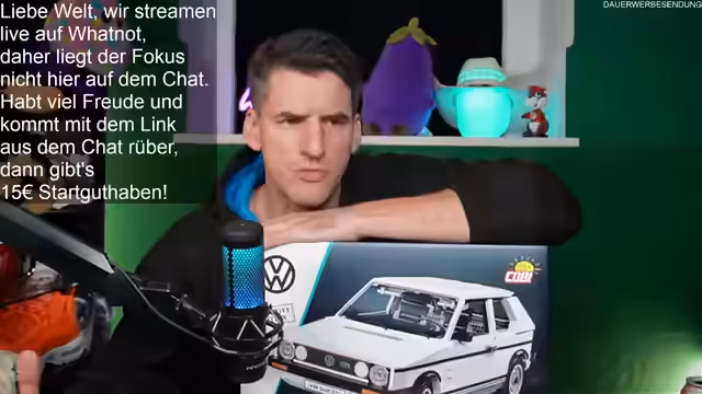 01:56:23Das Haupt-Giveaway, ein großer COBI-Golf GTI auf einer Platte, wird als Käufer-Giveaway gestartet. Teilnehmer müssen etwas in den Streams gekauft haben und auf 'Teilnehmen' klicken. Um die Teilnahmechancen zu erhöhen, werden Spider-Man-Figuren für 3,20 Euro und DC Booster für 2,50 Euro im Flash Sale angeboten. Die Chancen für den Golf GTI stehen mit 1 zu 43 sehr gut. Der Streamer ermutigt die Zuschauer, bei technischen Problemen die App neu zu starten. Nach dem Ende dieses Streams wird auf Twitch bis 23 Uhr weitergestreamt. Es wird noch ein letzter Flash Sale für einen Dino gestartet, bevor der Gewinner des Golf GTI gezogen wird.