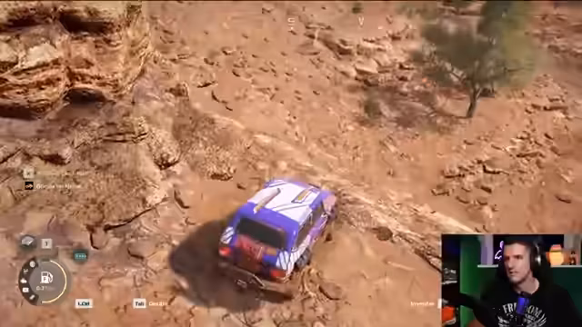 00:54:28Die beiden stellen fest, dass sie das Spiel im 'Speedrun'-Modus spielen, da es so einfach ist. Sie müssen wieder den Berg hoch und erhalten den Hinweis, den Reifendruck zu senken. Der Streamer macht etwas kaputt und beschädigt seinen Motor. Sie entdecken, dass sie die ganze Zeit ohne Allradantrieb gefahren sind. Nach Aktivierung des Allradantriebs fährt der Truck problemlos den Fels hoch. Der Streamer kommentiert ironisch ihre eigene Dummheit. Es folgt ein Unfall, bei dem der Streamer Reifenschaden an allen vier Reifen erleidet. Sie entdecken Dino-Knochen und eine Ressourcenzone, können aber nicht handeln, da der Partner bereits handelt.