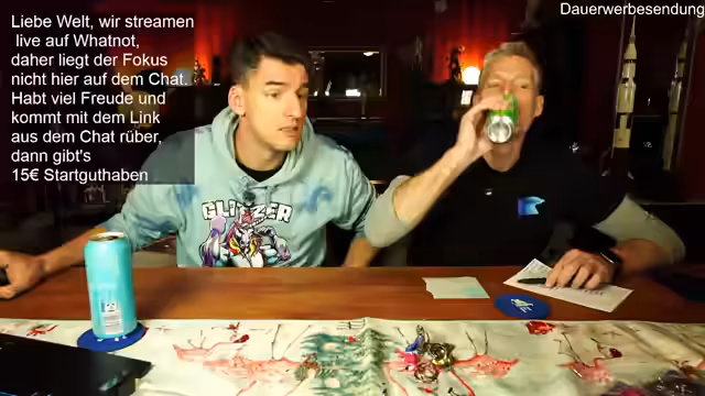 00:07:50Nach erfolgreicher technischer Einrichtung wird den Twitch-Zusch mitgeteilt, dass der Stream parallel auf WhatNot läuft. Der WhatNot-Invite-Link wird gepinnt und der Hinweis zur Nutzung des Neukundengutscheins wiederholt. Der Streamer geht auf die Vorteile von WhatNot als Live-Auktionsplattform ein und bewirbt die Schlüsselanhänger als hochwertige Produkte.