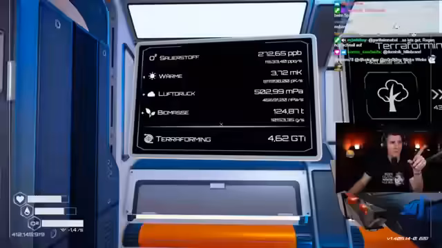 00:23:59Nachdem der Stream nahtlos startet und alle technischen Aspekte wie Tonregeln geklärt sind, wechselt der Fokus auf das Hauptspiel 'Planet Crafter'. Der Streamer gibt einen Überblick über den aktuellen Stand der Basis, die errichteten Produktionslinien und die erreichten Stufen der Terraforming-Prozesse. Er zeigt die Übersicht der erzeugten Ressourcen wie Sauerstoff, Wärme und Biomasse und kündigt an, dass der heutige Fokus auf der Erforschung neuer Gebiete und der Entdeckung von Insekten liegt.