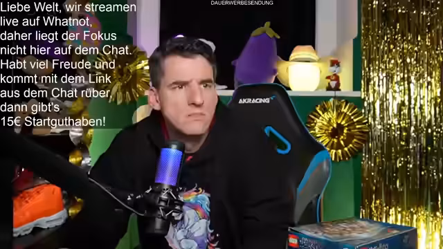 01:49:19Für die Follower wird ein Giveaway gestartet, bei dem ein Set von LEGO zu gewinnen ist. Der Streamer ermutigt die Zuschauer aktiv daran teilzunehmen. Kurz darauf wird der Übergang zum nächsten Stream-Abschnitt angekündigt, der einen gemeinsamen Chat mit dem Kollegen Gorilla beinhaltet. Dieser Übergang wird als große Party und unfassbar beschrieben und die Zuschauer zum Mitmachen und Verbleiben im Stream animiert.