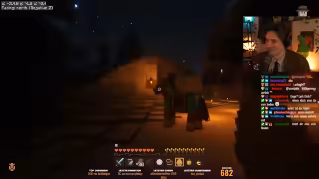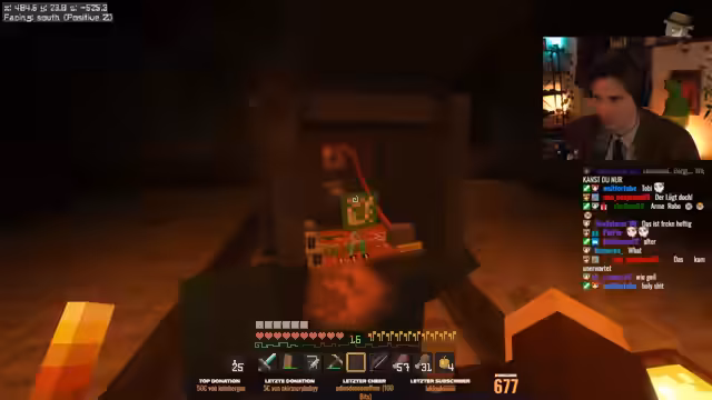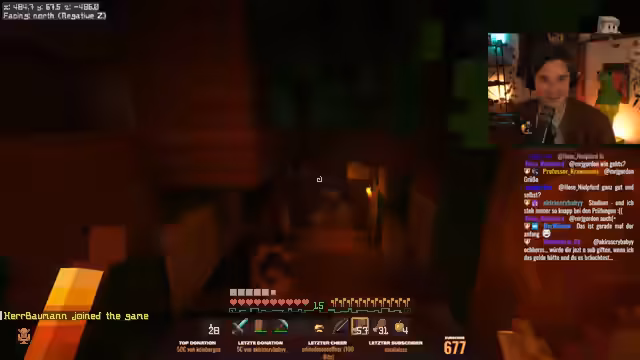 02:35:42Der Streamer gelangt in einen anderen Raum, der voller Bücher ist, und beantwortet mehrere Quizfragen über 'Minecraft Leben', darunter die Identität seines unsichtbaren Freundes 'Licht' und die Beschreibung seines bösen Doppelgängers 'Missing Bergman'. Nachdem er ein Zahlenschriff knackt, befreit er Jule und Sophie, die hinter einer Wand gefangen waren, aus der Zelle.
